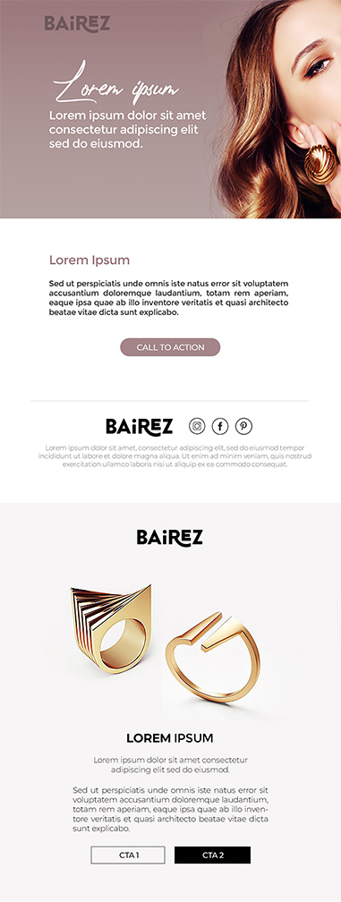 This project focused on the design and development of a responsive email marketing template for Bairez, a jewelry brand. The email layout was carefully structured to maintain a luxurious and elegant aesthetic, aligning with the brand's identity. The design features high-quality imagery, soft pastel tones, and a minimalist font selection to create a visually appealing and sophisticated look. The template was fully optimized for different screen sizes, ensuring a seamless experience across desktop, tablet, and mobile devices. The primary goal was to create a visually compelling and user-friendly email design that aligns with the brand’s identity while ensuring high engagement and conversion rates.